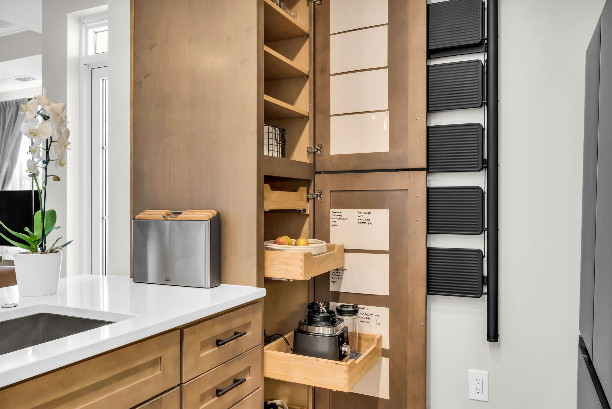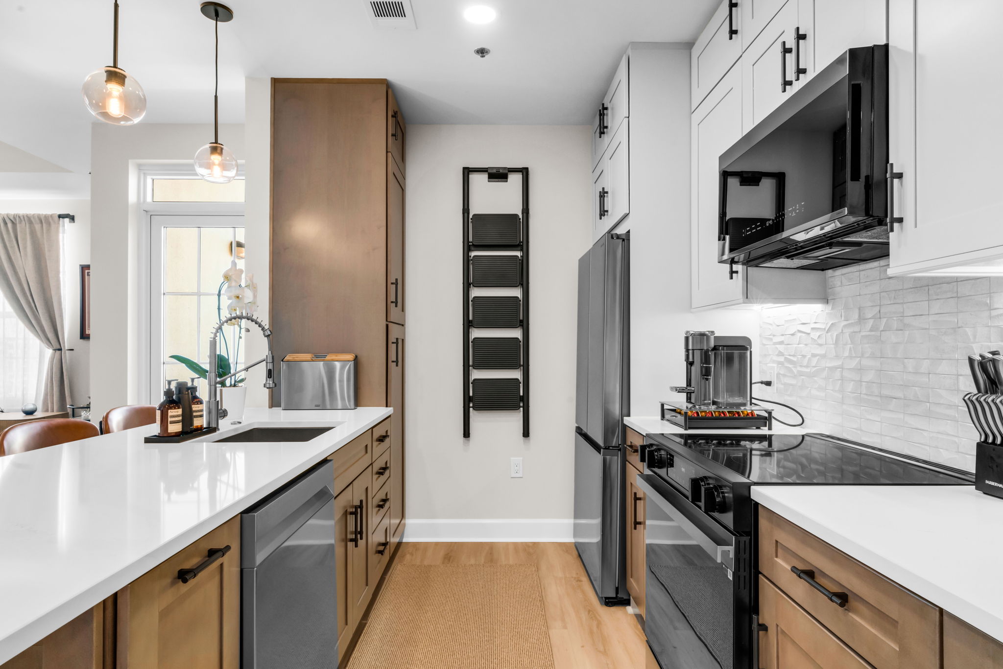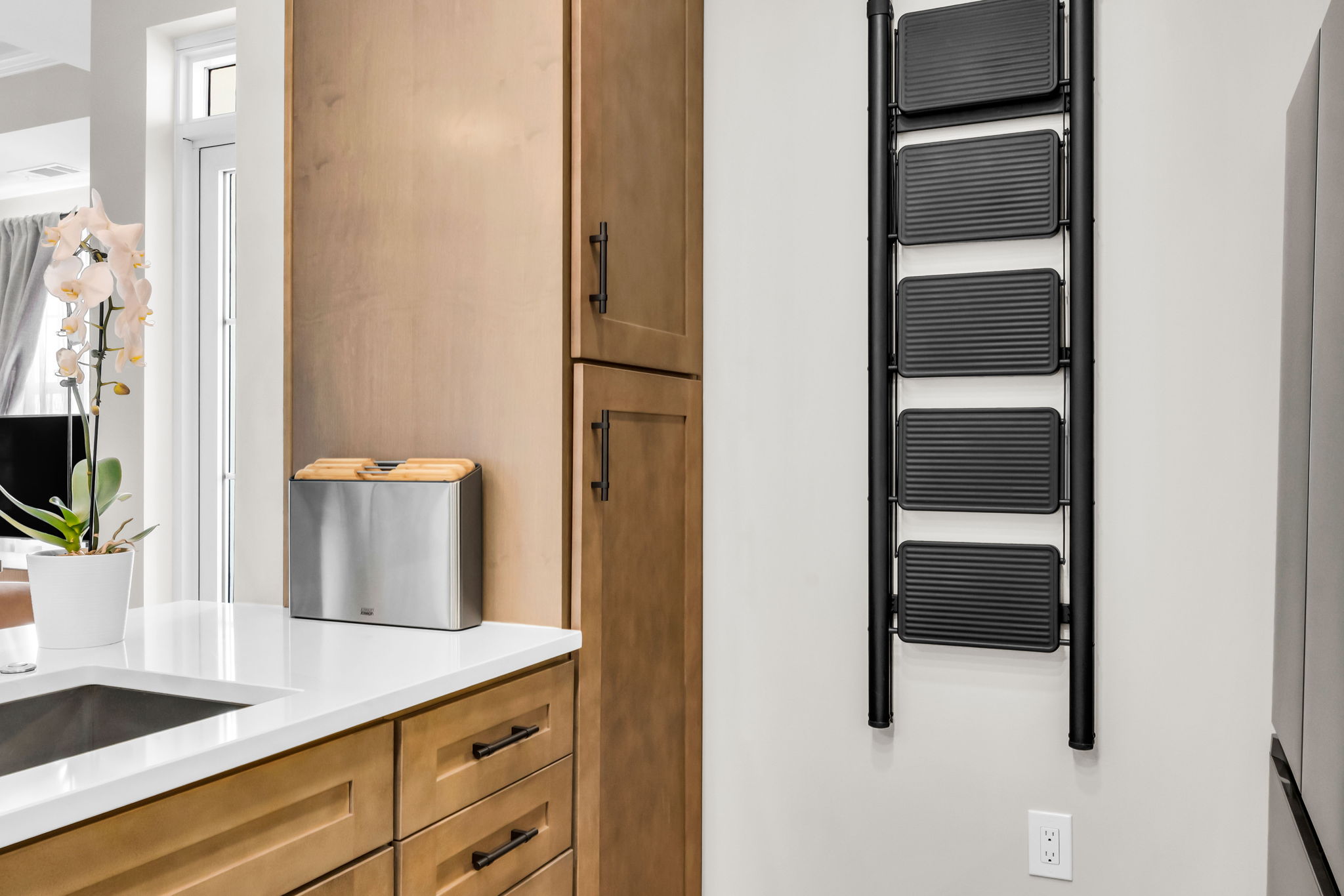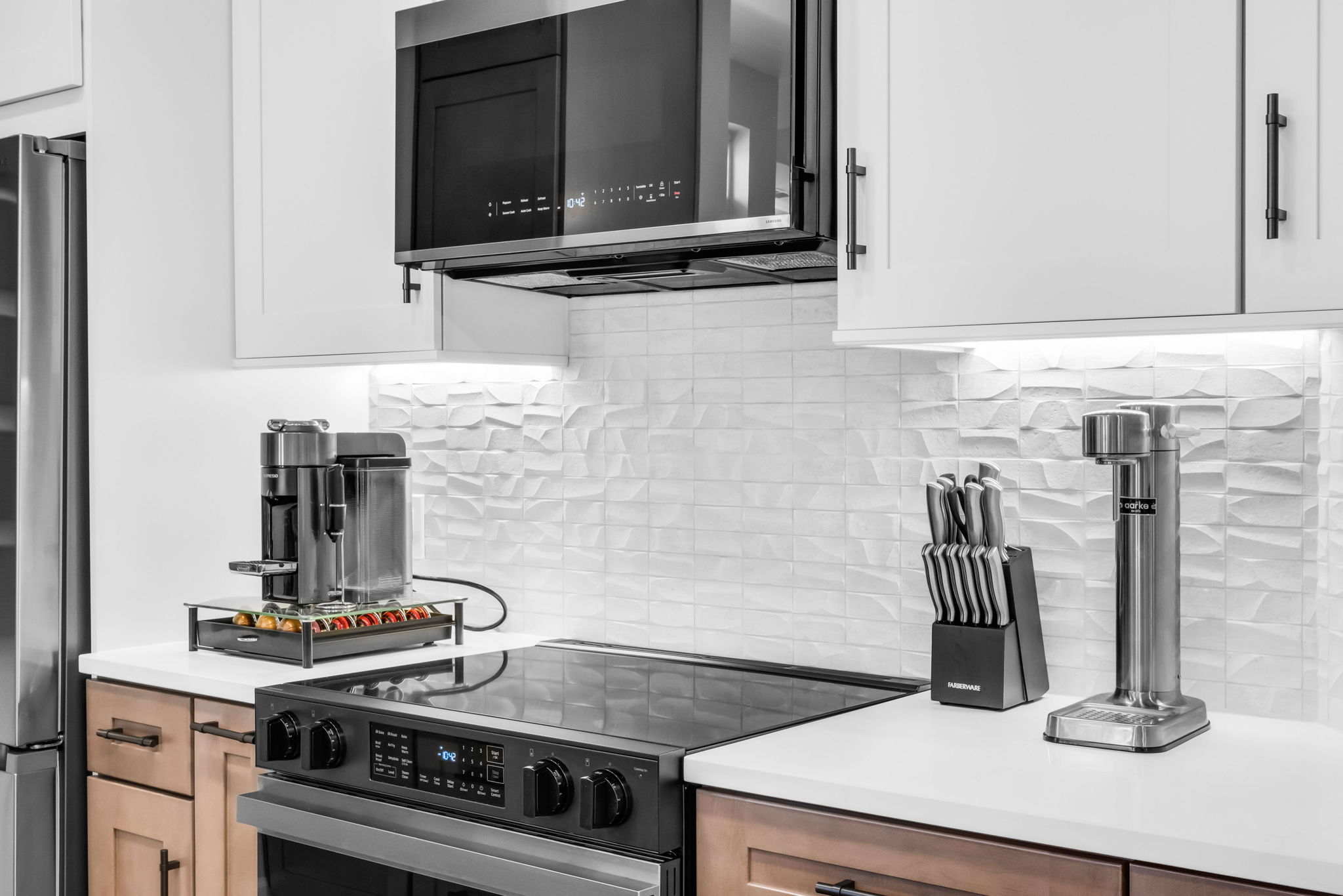 The kitchen is entirely custom featuring bespoke cabinetry, smart appliances, a pantry with pull-out drawers, built-in organizers, under-cabinet lighting, Porcelanosa mosaico tile backsplash, a water filtration system, quartz countertops, and designer hardware from West Elm. It’s as functional as it is beautiful, with views that open seamlessly to the living area, perfect for both entertaining and everyday living.