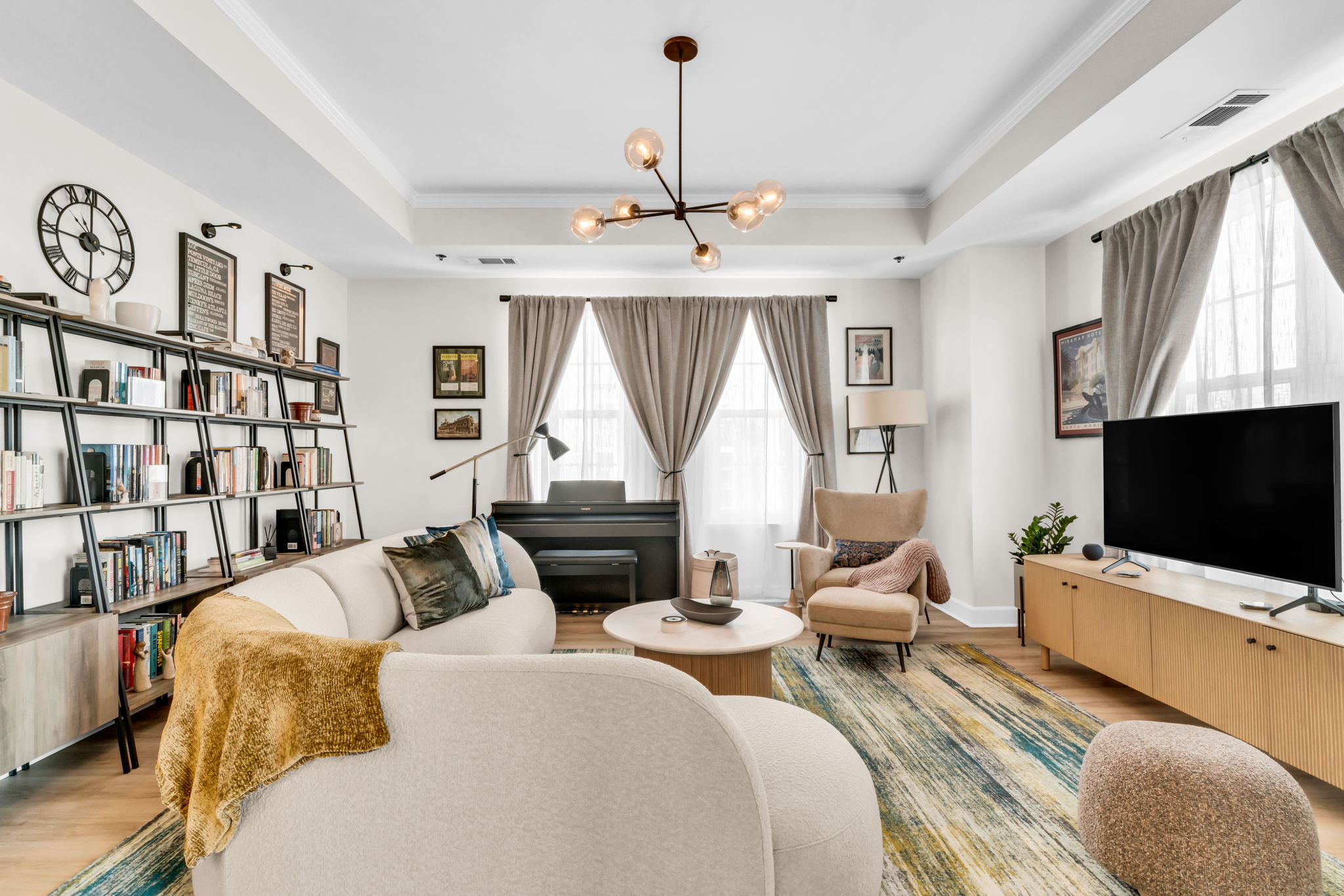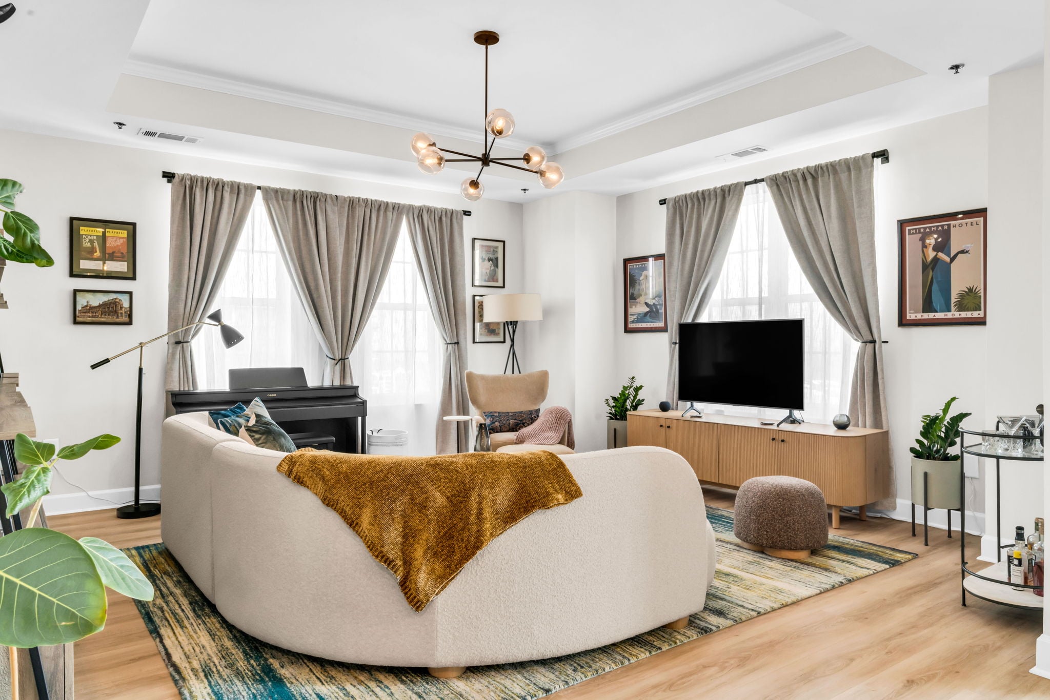 The living room is generously scaled and filled with light, opening to a private patio overlooking northeast Buckhead, an ideal spot for morning coffee or evening unwinding.
