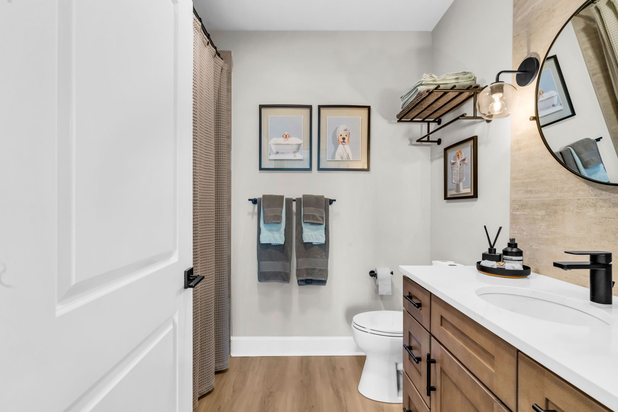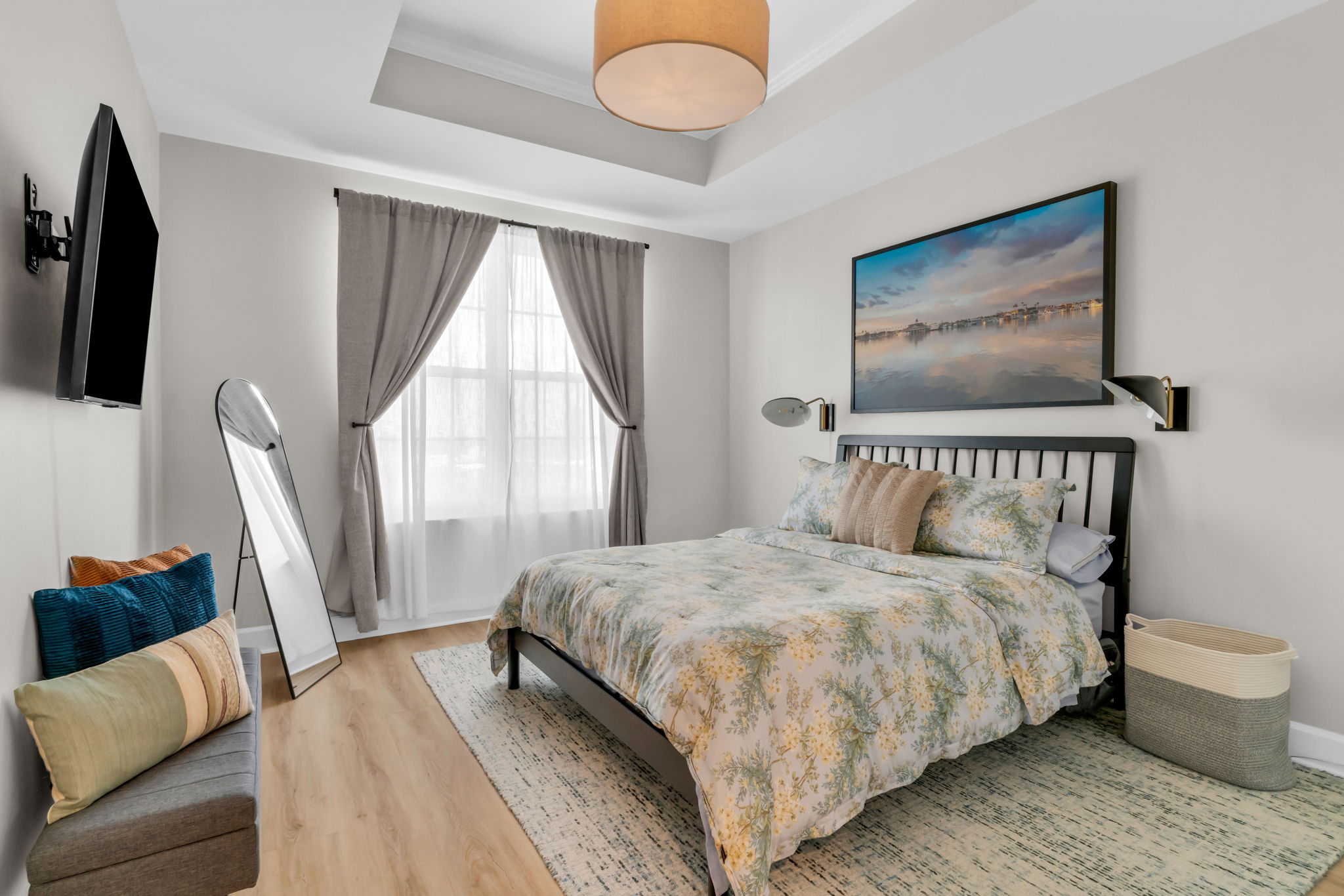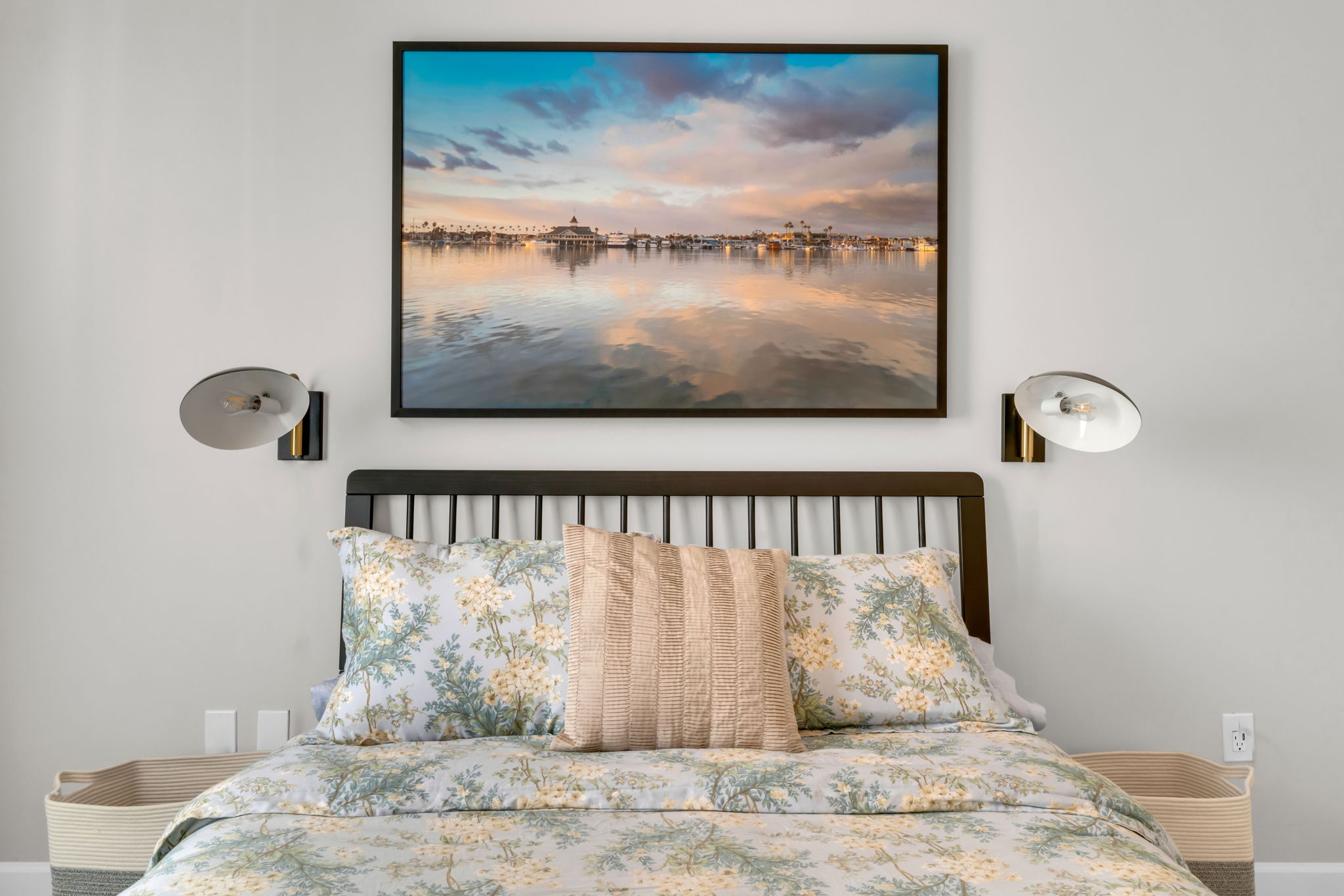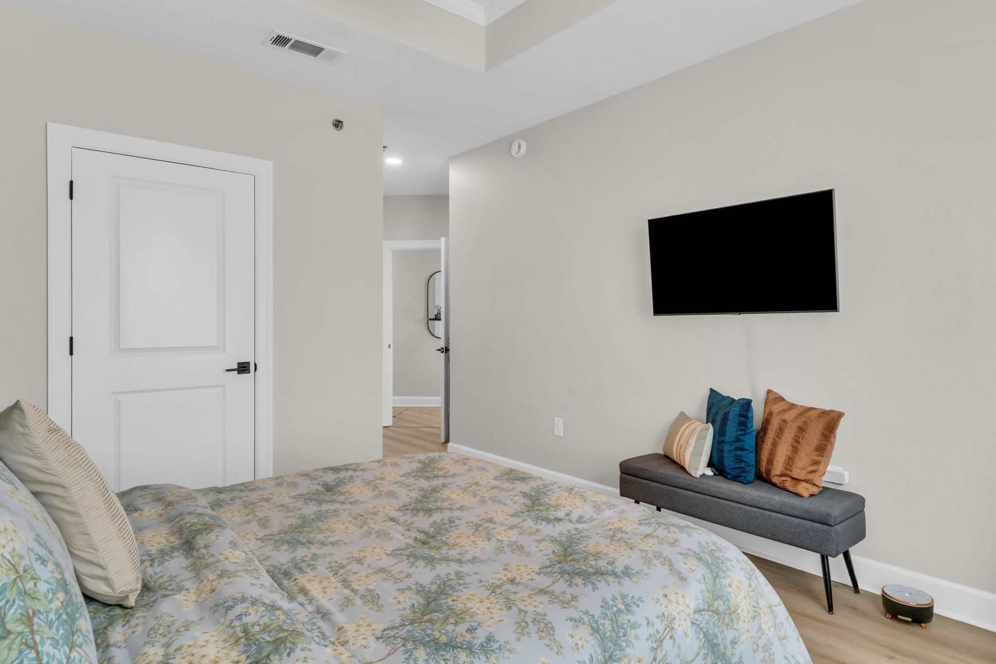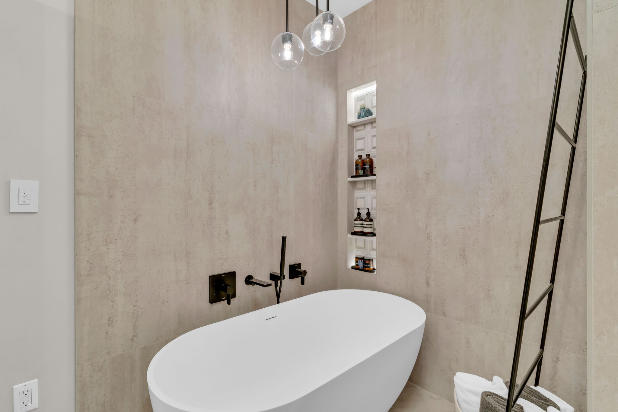 The secondary bedroom is equally well-appointed with a custom closet system, and the adjacent bathroom continues the elevated design with Porcelanosa tile and a deep Kohler soaking tub giving guests their own spa-like experience.
