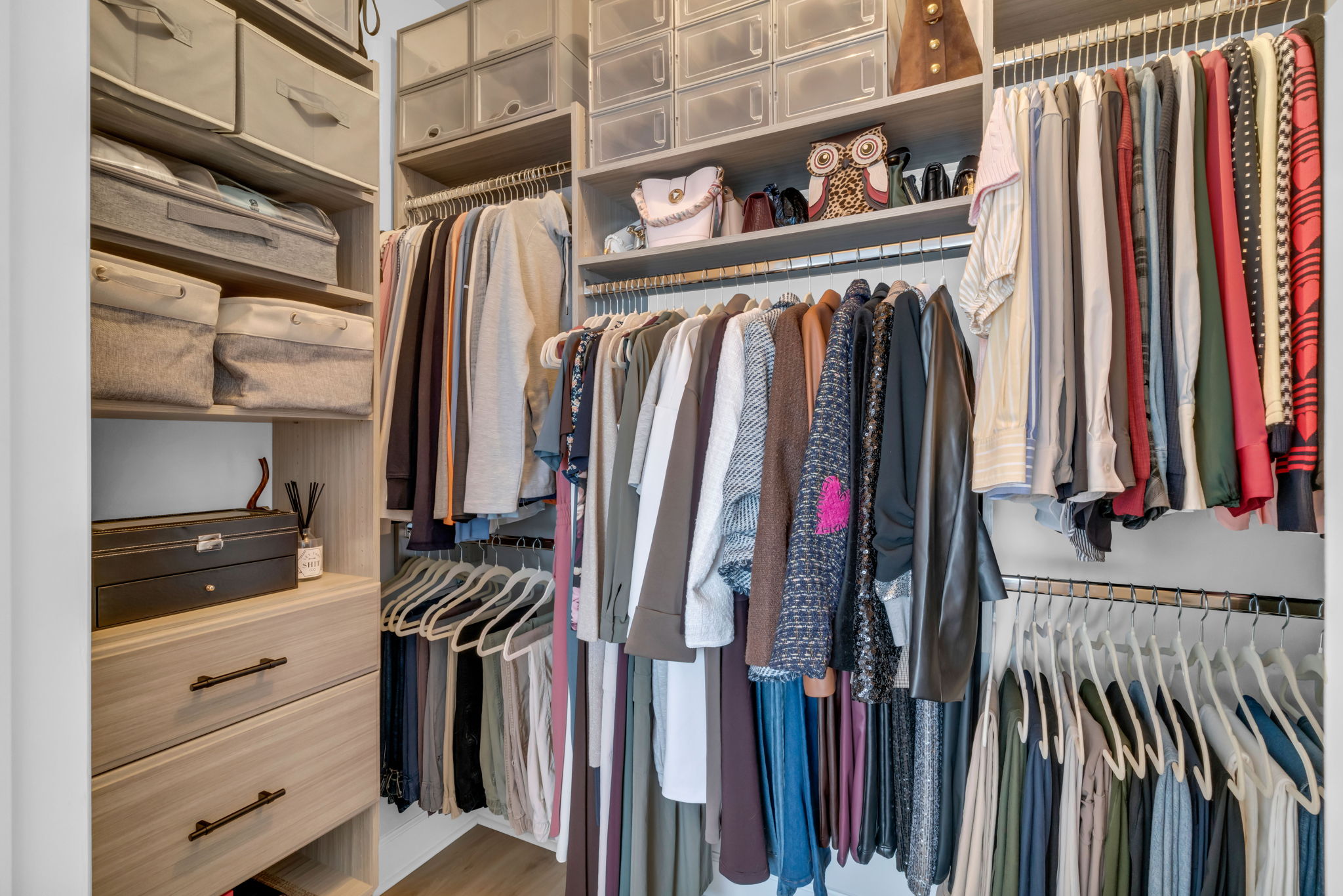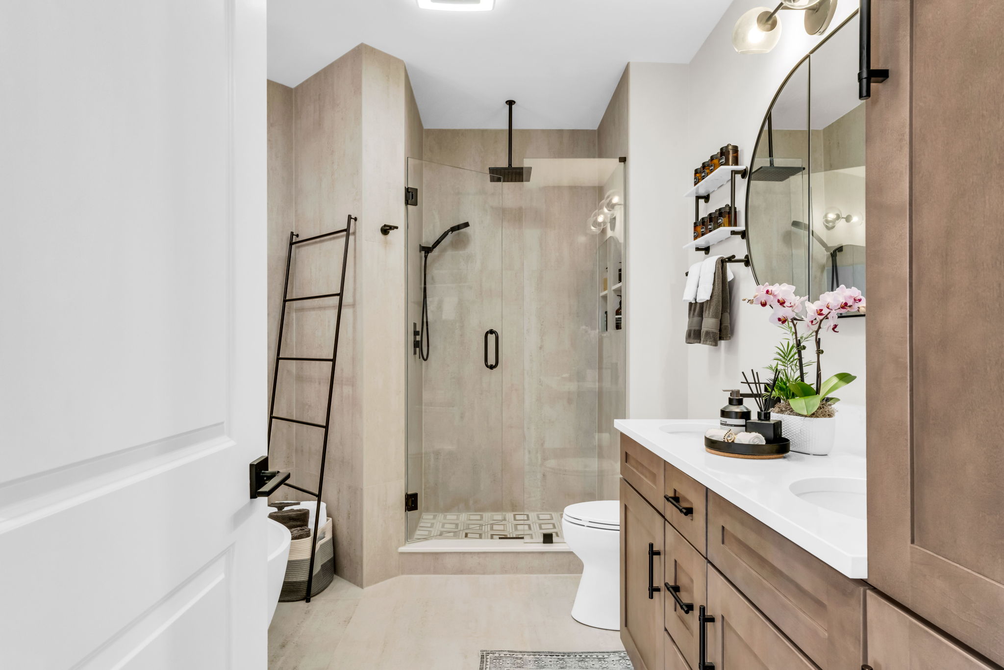 The primary suite feels like a boutique hotel retreat. Outfitted with Kohler fixtures, it showcases a sculptural soaking tub with a built-in Bluetooth speaker so you can relax with music, custom shelving with ambient uplighting, and a sleek dual-function vanity. The walk-in shower includes both waterfall and handheld options, along with thoughtfully designed dual niches to keep everyday essentials neatly tucked away. Hand-selected Porcelanosa tile creates a soft, spa-inspired palette throughout. The walk-in closet is fully customized and beautifully organized, worthy of its own spotlight.